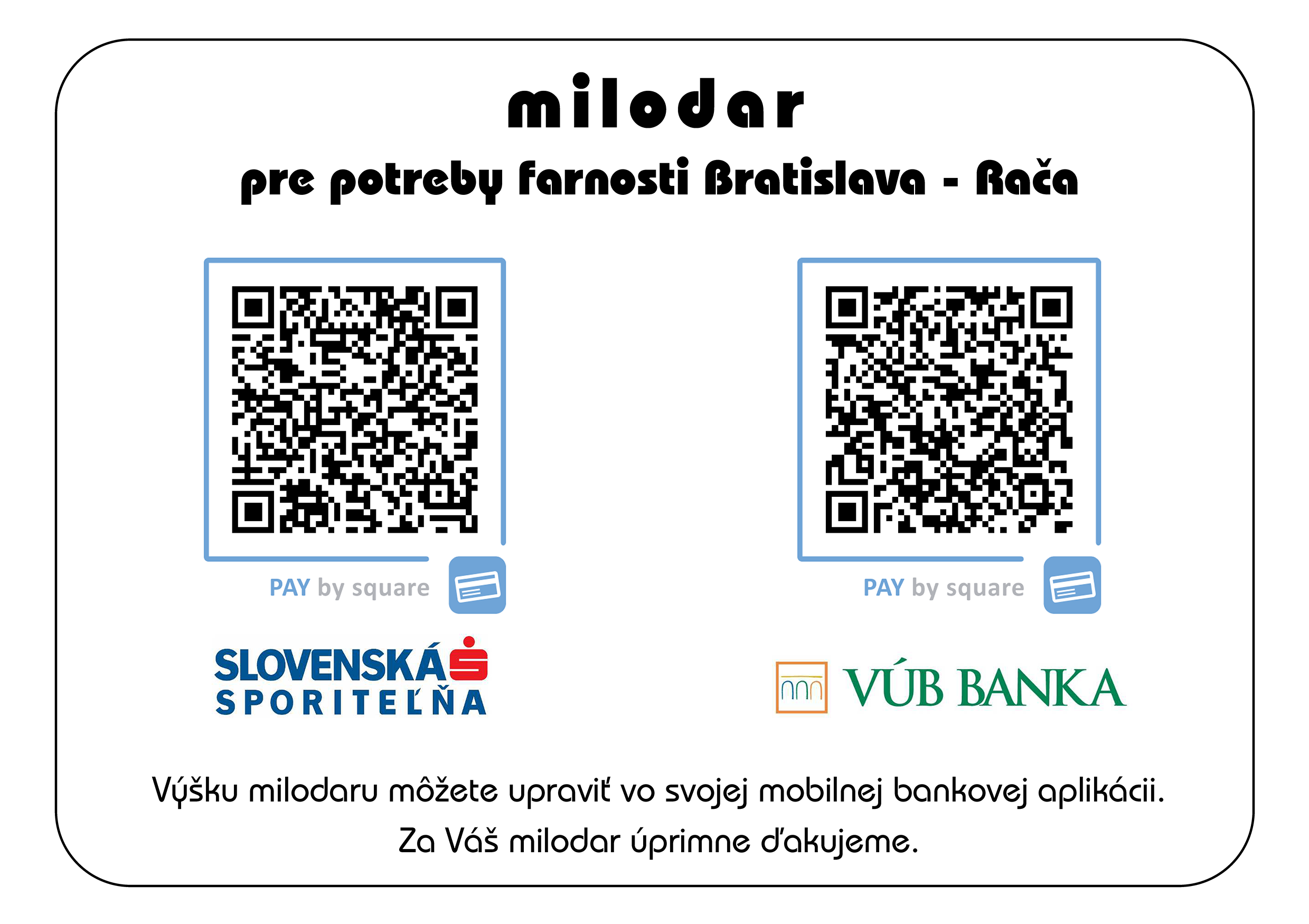 Pán Boh odmeň za Vaše milodary na potreby farnosti Bratislava – Rača.